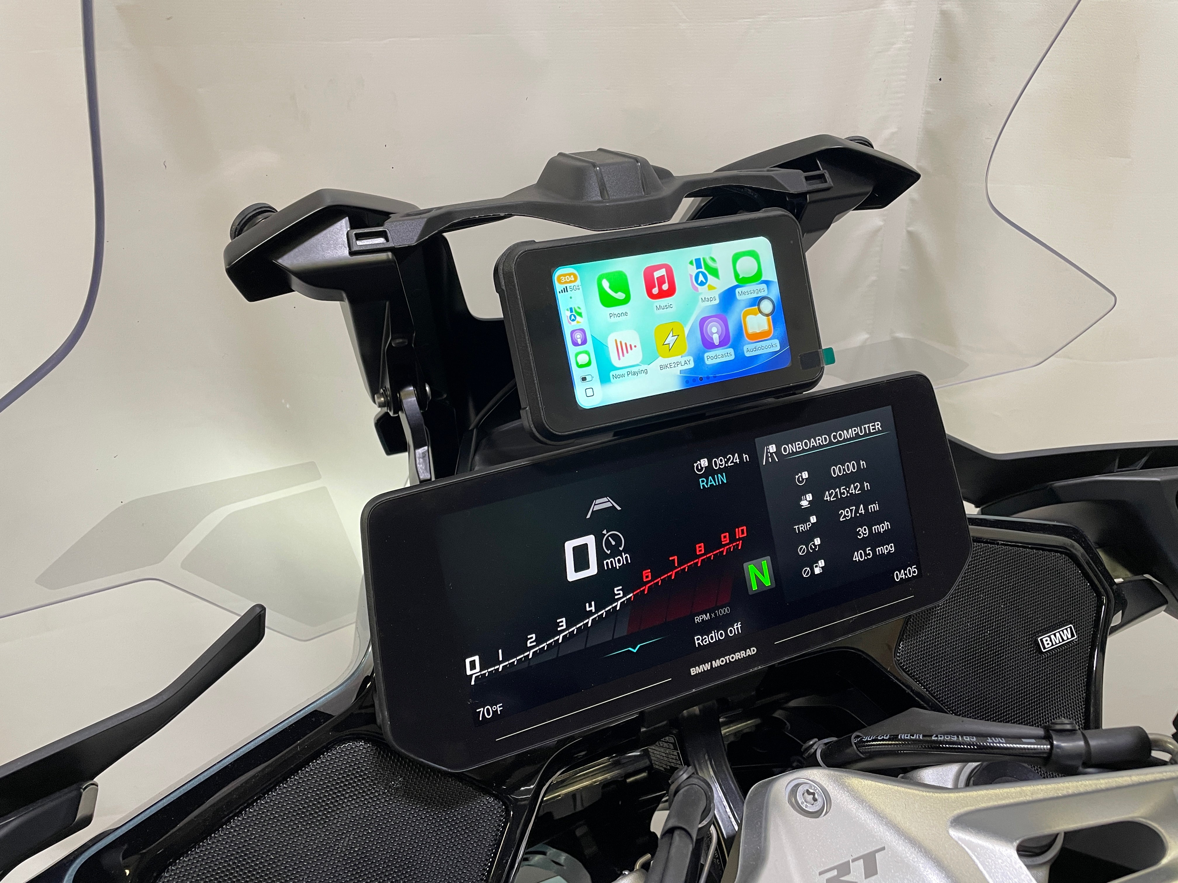 The Bike2Play for the 2025+ BMW R1300RT's is an Apple CarPlay & Android Auto add-on device. Your phone wirelessly connects to the device, allowing for full access to your maps, music, and more via the user friendly Apple and Android interface. You also remain Bluetooth connected to your bike or helmet for audio, with continued use of the BMW wonder wheel for music track forward and backward.
