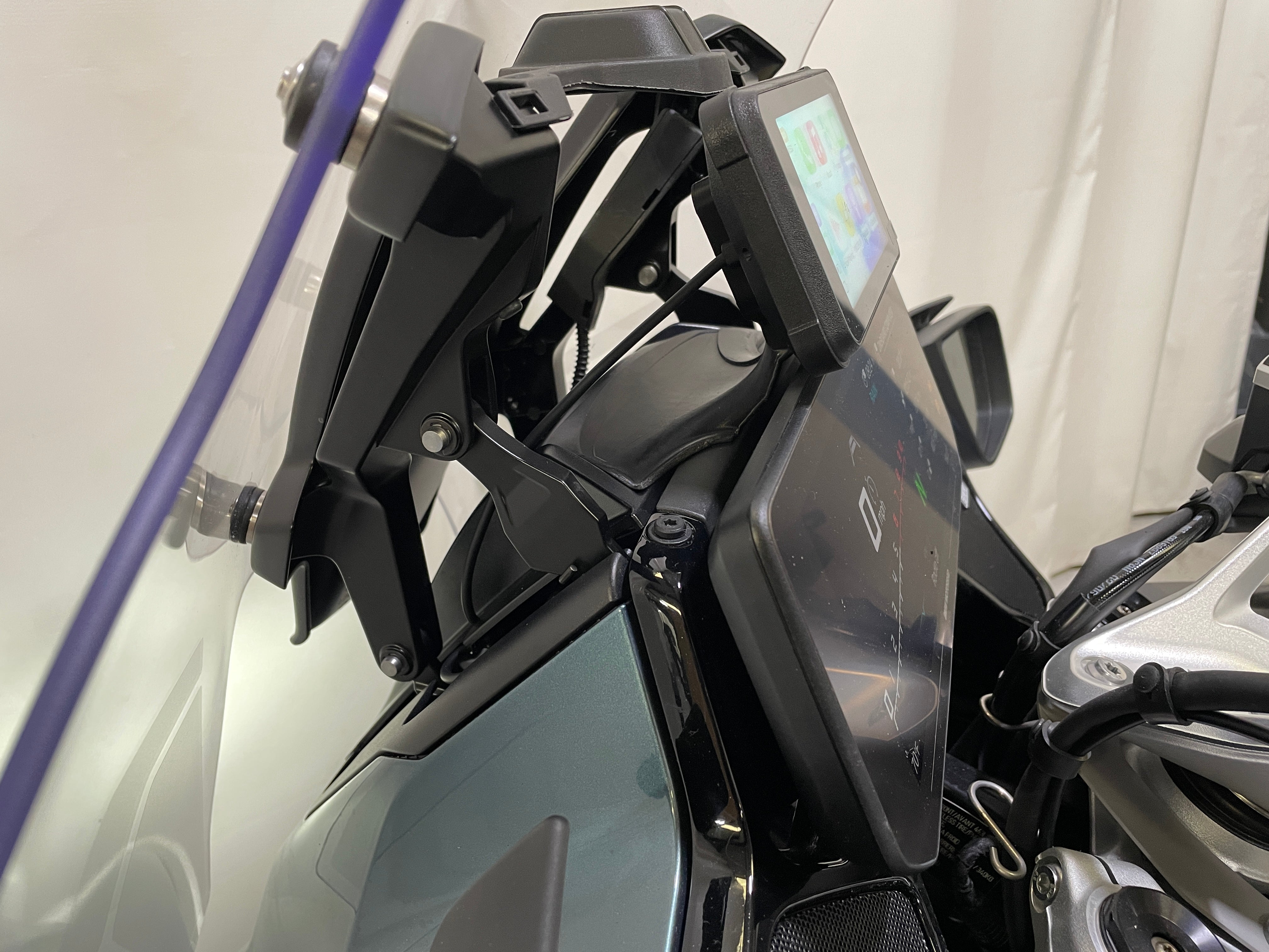 It includes a custom mount specific to the R1300RT that mounts directly above the TFT, and is plug and play powered from the OEM navigation port. No permanent modifications to the bike, and is a VERY simple installation. Pictures are shown with and without a Wunderlich sun shade installed on the bike